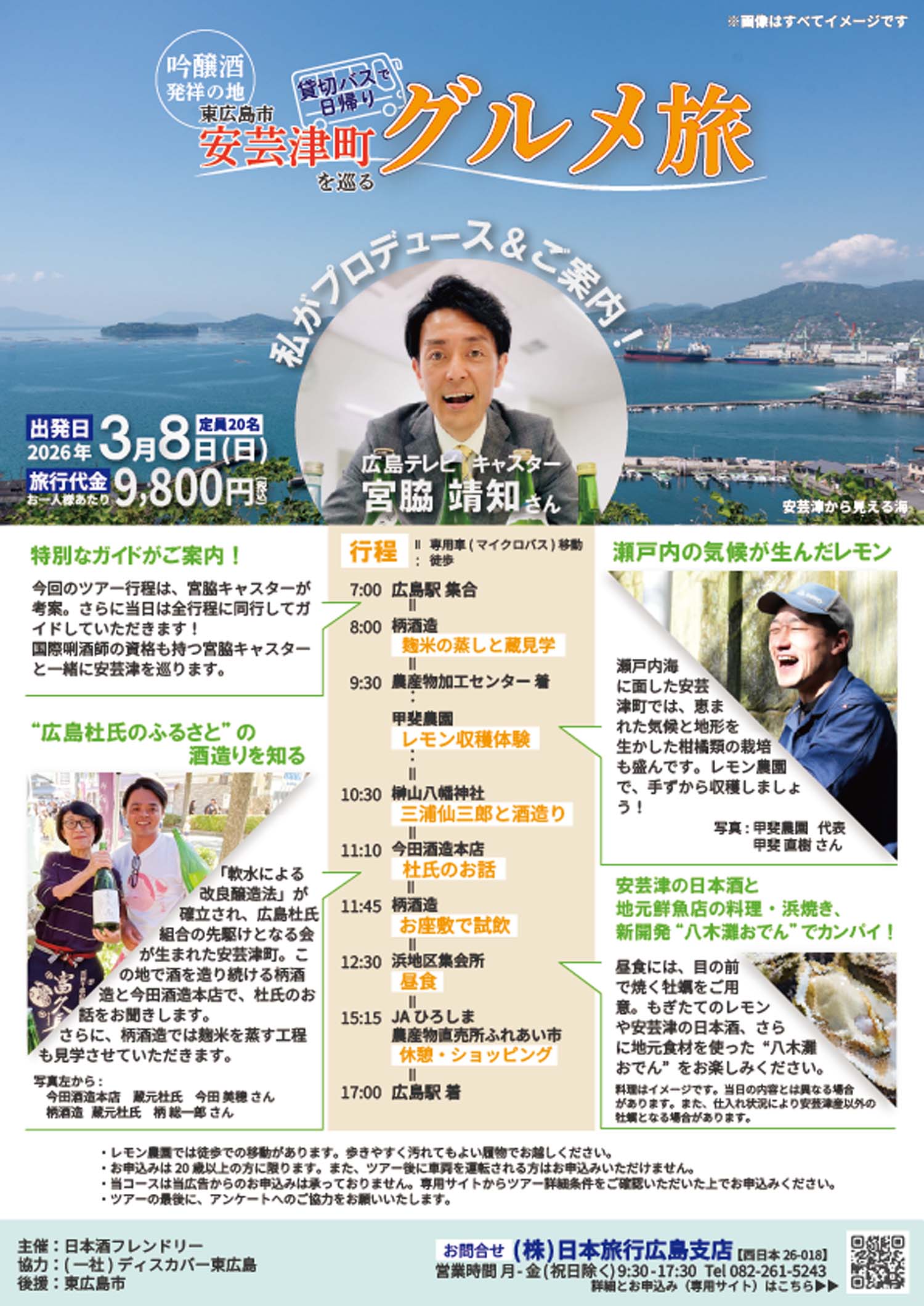 移動中の車内をはじめツアー全体では、広島テレビキャスターの宮脇靖知さんが、安芸津の魅力を軽快にご案内します。