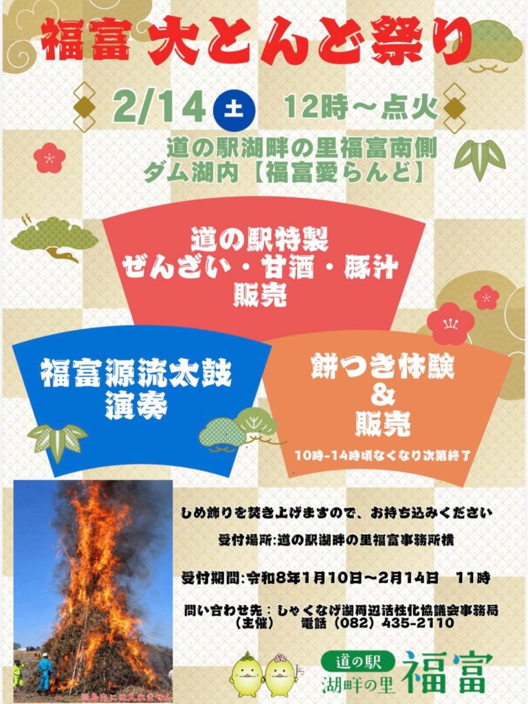 2026年2月14日(土)、道の駅湖畔の里福富にて「福富 大とんど祭り」が開催されます!