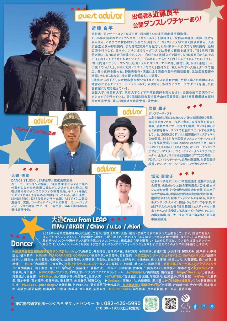 ゲストアドバイザーには、ダンスカンパニー「コンドルズ」主宰の振付家・ダンサー 近藤良平氏を迎え、出演者との公開ダンスレクチャーも実施。