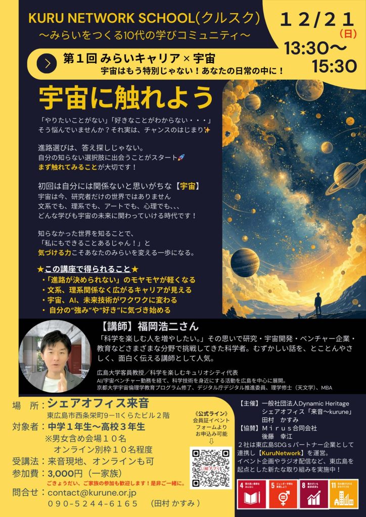 2025年12月21日(日)、JR西条駅近くのシェアオフィス来音にて「第1回みらいキャリア×宇宙」をテーマとした講座が開催されます!