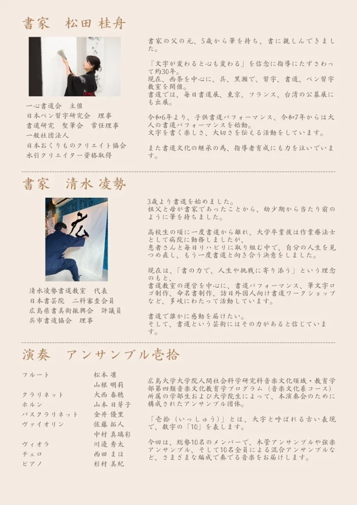 本公演では、書家の松田 桂舟先生、清水 凌勢先生による迫力ある書道パフォーマンスと、広島大学のアンサンブル壱拾が奏でる音楽が響き合う、特別なコラボレーションをお届けします。