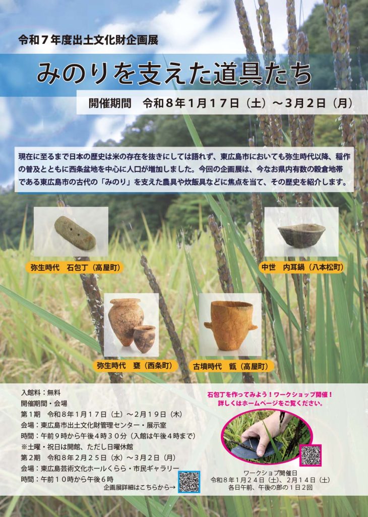 本企画展では、現在も県内有数の穀倉地帯である東広島市に焦点を当て、古代の「みのり」を支えてきた農具や炊飯具などを通して、その歴史を紹介します。