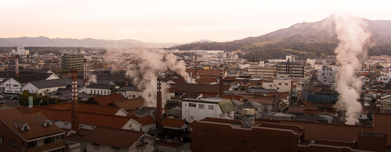 酒造りに適した気候と清らかな水などの好条件が揃う西条には、7軒の酒蔵が集積。白壁に映える赤瓦、なまこ壁、そして並び立つ赤レンガの煙突が、酒都ならではの景観を形づくっています。