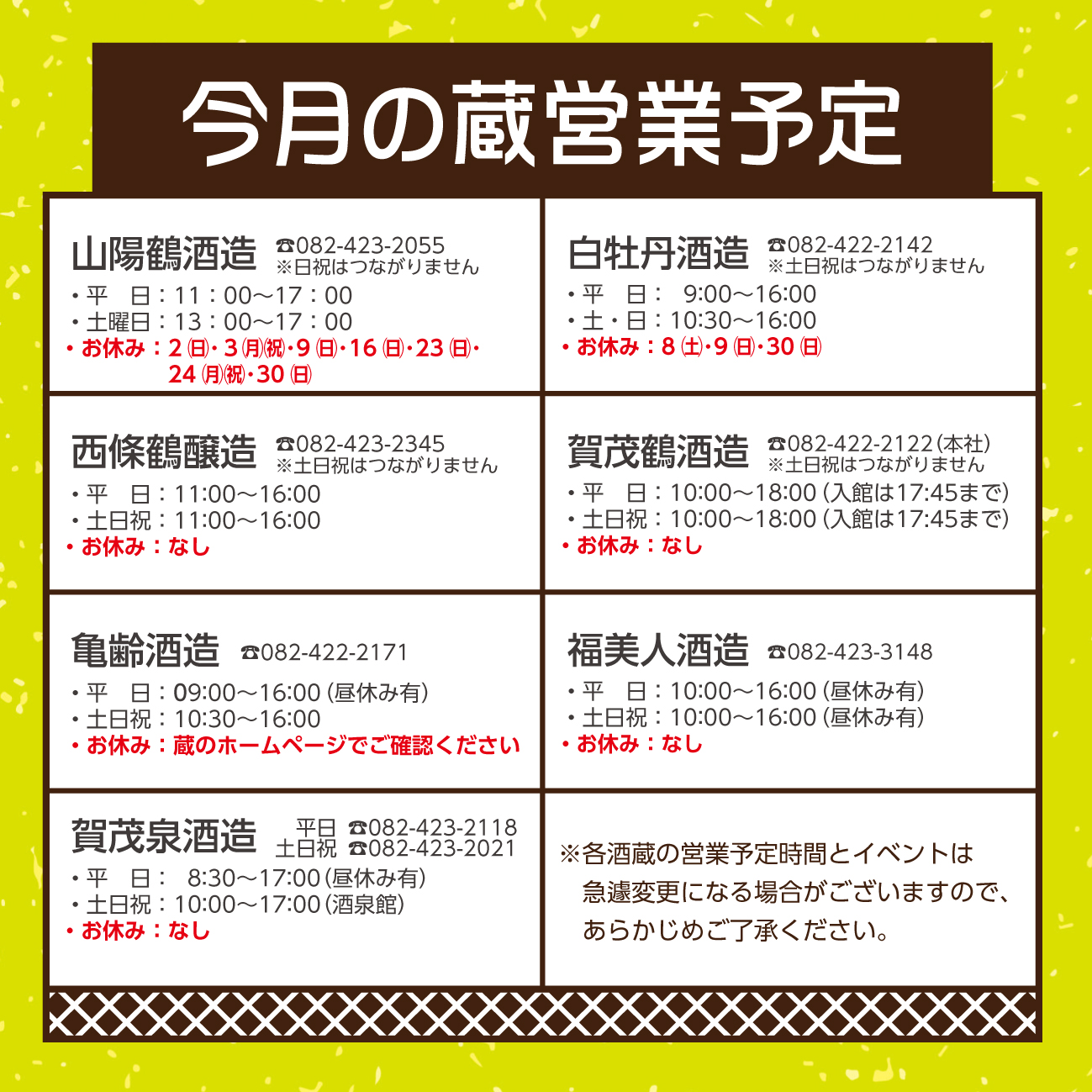 今月の酒蔵営業予定(西条の7つの酒蔵)