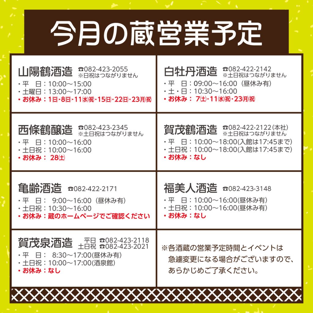 今月の酒蔵営業予定(西条の7つの酒蔵)