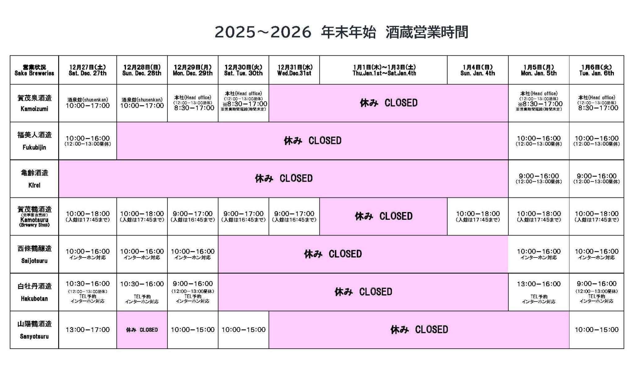 2025年から2026年の年末年始(12月28日(日)〜1月6日(火))における、西条酒蔵通りにある7つの酒蔵の営業日時をお知らせします。
